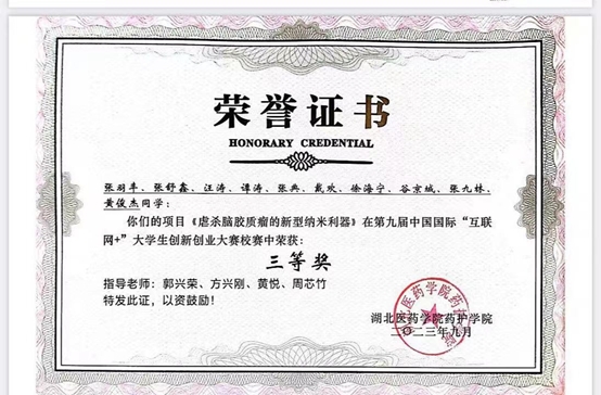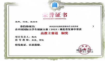 在2023年第十八屆挑戰杯中,團隊成員成功克服一切困難,相互支持,助力項目完成,《“瘤”暗花明—虐殺腦膠質瘤的新型納米利器》項目榮獲了湖北省省賽銅獎。