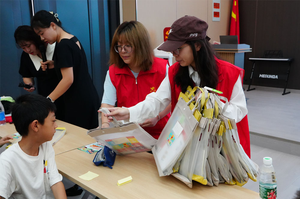 隨后,孩子們高興地領取了愛心暑托班書包,這將會承載著不一樣的青春回憶,也是對他們后面學習的鼓勵。
