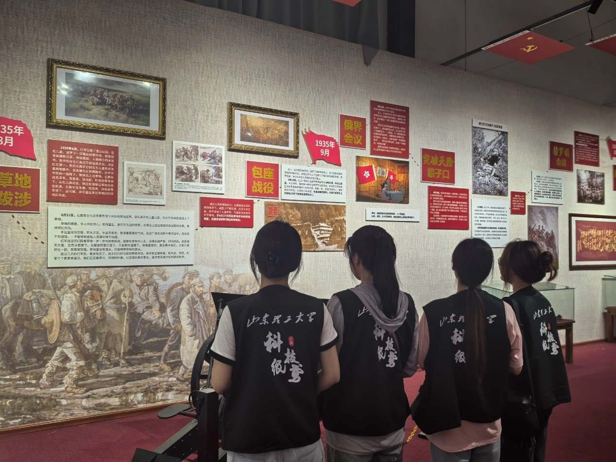 7月20日,科技紙鳶實(shí)踐團(tuán)全體成員前往濟(jì)南市商河縣長(zhǎng)征精神紀(jì)念館,學(xué)習(xí)經(jīng)典紅色長(zhǎng)征精神。在紀(jì)念館內(nèi),實(shí)踐團(tuán)成員們?cè)趯?zhuān)業(yè)解讀人員的帶領(lǐng)下,深入了解了長(zhǎng)征這一偉大歷史事件的背景、歷史原因、戰(zhàn)略轉(zhuǎn)折點(diǎn)以及最終的勝利會(huì)師。