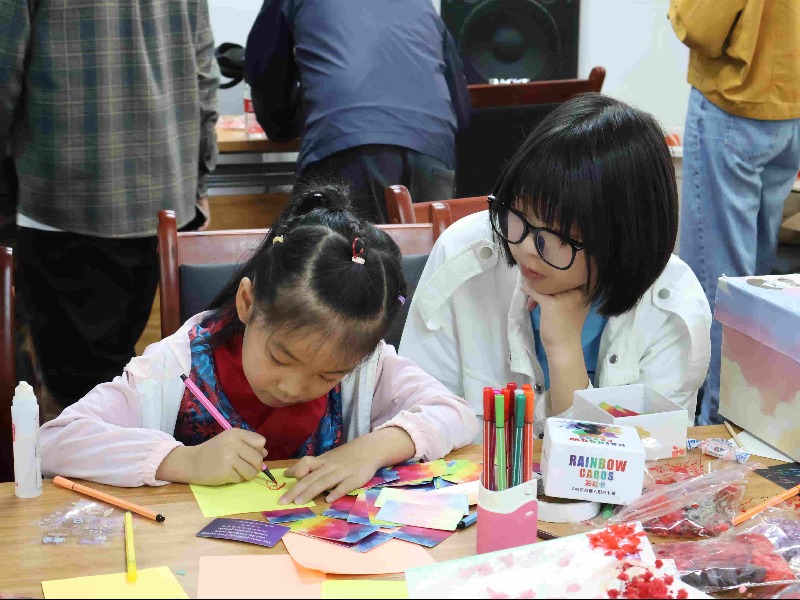 花藝工坊和心靈畫布兩個活動大受歡迎,大朋友們和小朋友們沉浸在自由創(chuàng)作的快樂里,攤位的長桌前圍滿了人,連投影儀前的桌椅都被我們“征用”。