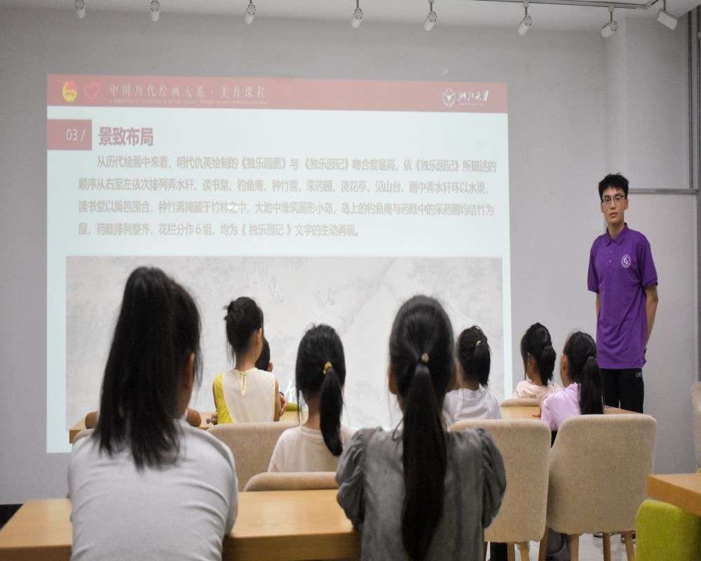 活動伊始,“繪心繪意”志愿宣講團隊長趙慕容同學作為主講,他以深厚的知識功底和生動的講解方式,帶領大家走進中國園林藝術的奇妙世界。他首先講解并梳理了中國園林的歷史脈絡,從先秦時期的宮苑到明清時期的私家園林,每一座園林都承載著時代的印記與文化的精髓。隨后,通過與孩子們的互動,趙慕容同學詳細闡釋了園林與園林繪畫之間的密切聯系。他表示,園林不僅是人們居住休憩的場所,更是文人墨客寄情山水、抒發情感的精神家園。而園林繪畫,則是對這一精神家園的藝術再現,它以其獨特的審美視角和表現手法,將園林之美凝固于紙墨之間。