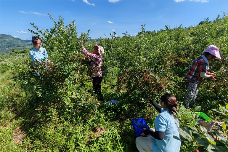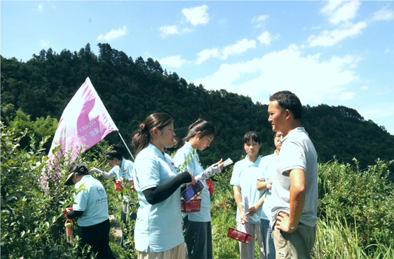 重慶外語外事學院國際商貿與管理學院渝你“綦”行鄉村振興促進團于2024年7月15日前往丁山鎮秋發村進行藍莓、蜂糖李、黃金芽產業等的情況調研,并深入藍莓生態園跟隨當地農戶一同開展藍莓采摘實踐。
