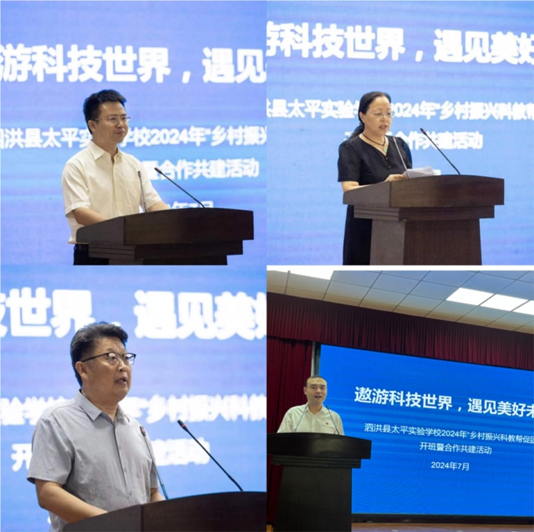 7月12日,共建大學生社會實踐基地簽約揭牌儀式在太平實驗學校報告廳順利舉行,儀式由南京工程學院駐泗洪鄉村振興工作隊隊員、計算機工程學院分團委書記孫大尉主持。儀式上,泗洪縣縣委副書記、省委駐泗洪縣鄉村振興工作隊隊長耿立昂發表致辭,對不辭辛苦來到太平實驗學校進行鄉村振興科教幫促、以實際行動助推鄉村教育振興工作的計算機工程學院師生一行表示肯定。泗洪縣教師發展中心副主任許璟發表講話,感謝南京工程學院計算機工程學院的大力支持,并對兩校合作建立社會實踐基地表示充滿期待。劉艷華副書記簡要介紹了學校和學院的專業設置和人才培養等基本情況,鼓勵學院本次參加科普課堂實踐活動的同學,主動將社會實踐融入到鄉村振興戰略大局中,發揚敢于吃苦、不怕困難的精神,發揮自身專業優勢,腳踏實地,在實踐中磨練意志、增長才干,以實際行動為學校學院增添光彩。學院“指尖智薈”科技志愿服務團學生代表楊星怡上臺發言,并向與會領導鄭重承諾在為期三天的科普課堂實踐活動中,會努力克服各種挑戰,圓滿完成本次實踐活動。