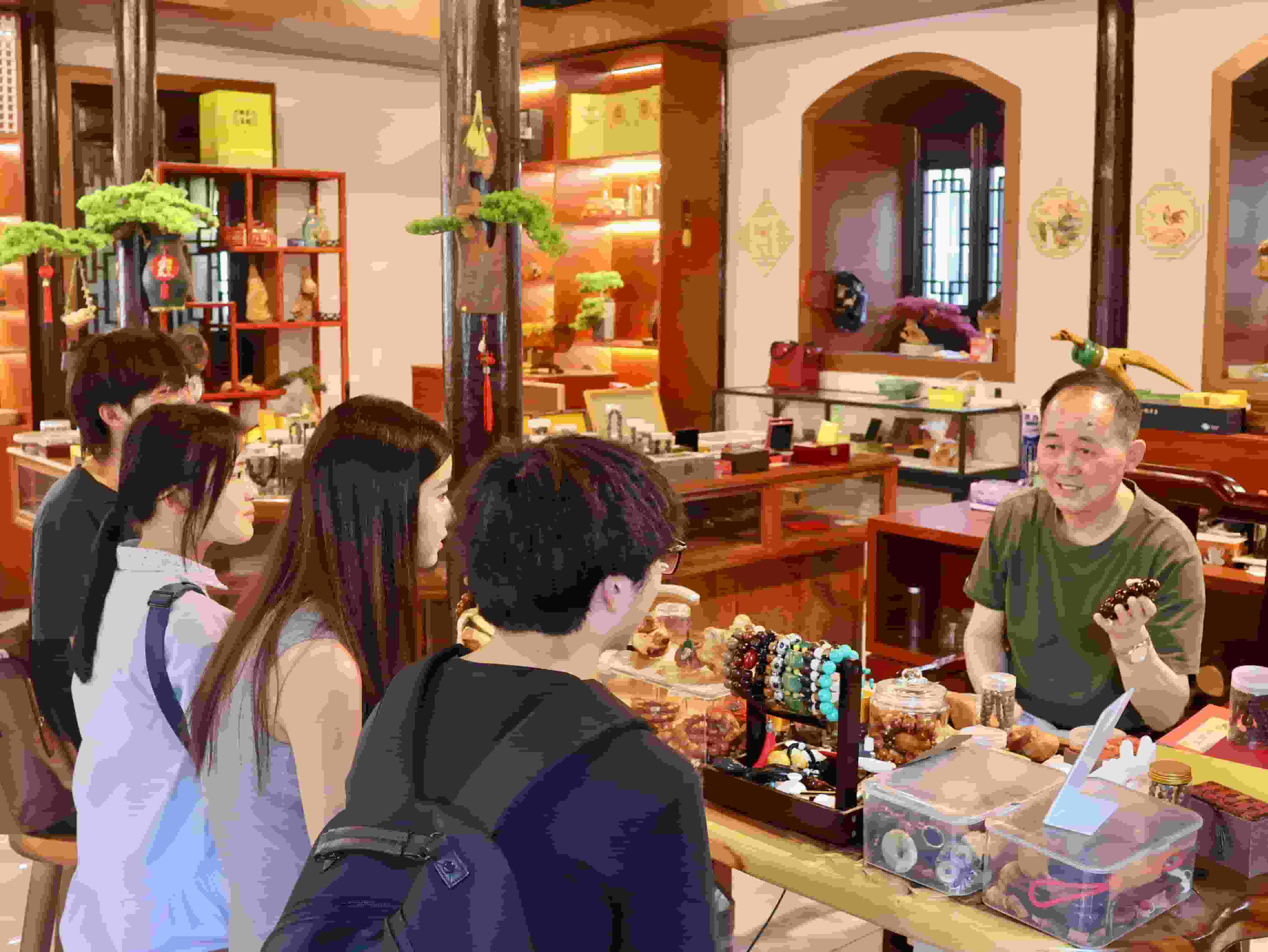 調研走訪期間,實踐團隊拜訪“水磨石地面銅畫”研創者、“柞榛老根”根藝者顧國宇老師,就古鎮基本建設歷程以及對本地居民影響等問題進行詢問。顧老師向團隊介紹,在當前的經濟環境下,由于本地鄉鎮普遍消費水平低、購買力不足且老年人口占比較高,栟茶古鎮作為本地規模較大、知名度較高的文旅景點并未達到預期效果。顧老師還表示,目前栟茶古鎮的收入較大部分仍來自于旅游團、研學等集體旅游項目,尤其在非節假日時,游客大多為旅行團成員和參與研學的學生和老師。此外,顧老師提出:發展鄉村文旅產業目前最大的難點在于如何解決打破同質化局面、提高本地特色文化知名度、吸引年輕人消費等主要問題。這些問題都不同程度地影響著各商鋪的經營,同時也為古鎮后續的發展提供了可完善的方向。