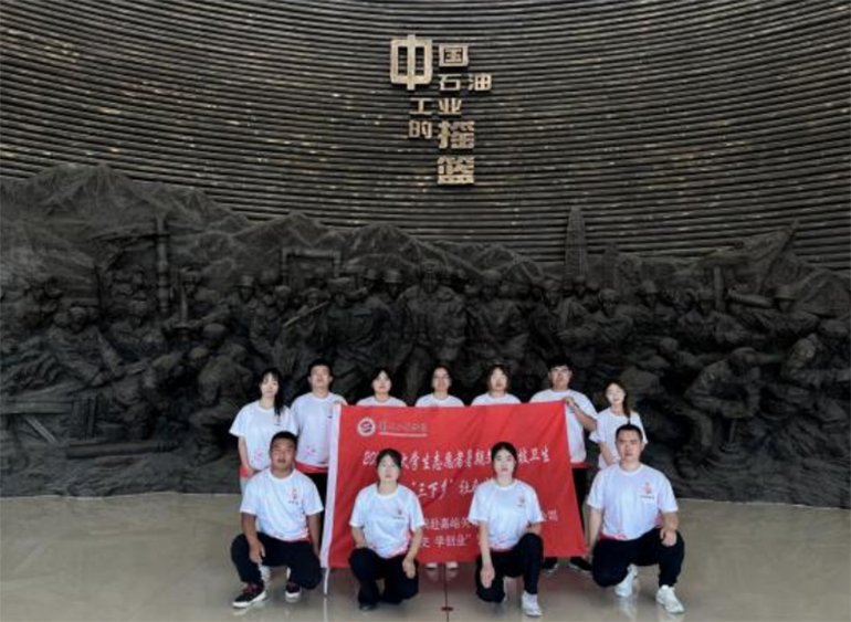 (圖為實(shí)踐團(tuán)成員在玉門油田展覽館合影留念/張倩倩、李梅梅 攝)