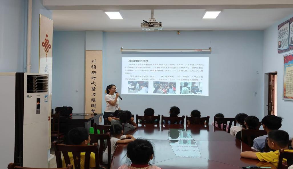 最后,29日,成員們在南寧市展開了一場宣講活動。青年是一個民族的未來與希望,更是文化傳承的主力軍。在宣講活動中,成員們通過PPT播放的形式,從神話傳說、載體簡介、前景傳承等主題入手,給當地的小朋友帶來了一堂生動有趣的文化知識普及課。課上,小朋友們從一開始的困惑到后來的積極提問,也讓成員們看到了盤古文化傳承的美好前景。