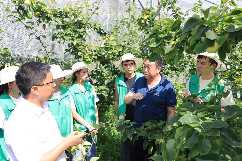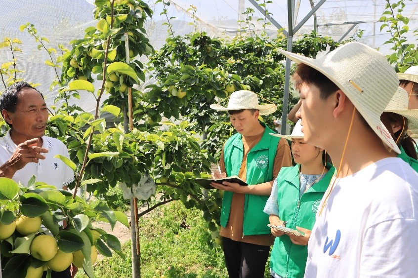 深入梨園,劉維建介紹著自己種植的梨樹品種,例如長把黃花梨、翠冠梨、早白蜜梨、黃金梨等。“每棵梨樹可產60—80斤梨果,每畝可以栽種梨樹110株,每畝純收入可達13000元,”劉維建說道,“今年由于降雨量增多,在金川縣本來不需要套袋的翠冠梨,果實表面形成了嚴重的銹斑,對果實的銷售產生了一定的影響。”團隊成員在觀察梨樹時也發現了這個問題,對此,實踐團成員給劉維建提出了建議:可采用二次套袋技術,并科學合理使用殺菌劑對梨果銹進行防治。