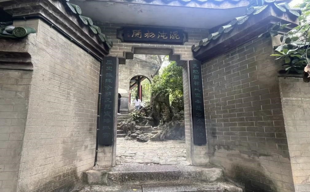 到達盤古廟后,首先可以看到的是由青瓦石磚砌成的,掛著“混沌初開”牌匾的宮式門,門洞兩側刻有兩聯,分別是“天地開辟此處本是名山勝境”和“歷史推陳今朝又見寶塔琳宮”。