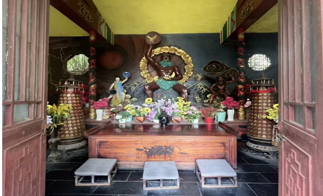 隨后,成員們穿過門洞來到廟前,廟門懸聯為“混沌初開天地神人尊盤古”“乾坤久奠苗瑤壯漢薦軒轅”,而廊柱題對曰:“始則同源旋而衍派百族發祥天地闊”和“始燃取火喜或營巢萬家競秀古今中”。廟內供奉著盤古像,神像簡介上寫該盤古神像濃眉大眼,廣額豐須,頭凸雙角,垂發披肩,一手高舉內有金烏的金色太陽,一手捧著有一蟾蜍以表示月色精光的月亮。除了盤古像外,雷公、電母、女媧、伏羲等神像也分列左右兩邊,但形體要比盤古神像略小。