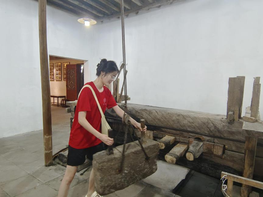 7月12日,實踐團成員們對益然香木榨文化產業園進行了深入考察。在園區負責人的陪同下,成員們參觀了油菜博物館,對油菜生長原理及菜籽油加工有了深刻全面的認識。隨后,成員們進一步探訪了歷史悠久的油坊,見證了非遺傳承師傅們精湛的手藝。他們運用重達近五百斤的鐵杵,以穩健的節奏敲擊木楔,展現了力與美的和諧統一。在師傅們精準掌控下,敲擊聲此起彼伏。成員們體驗了鐵杵沖榨,感受非遺工藝魅力,同時體會傳承艱辛。