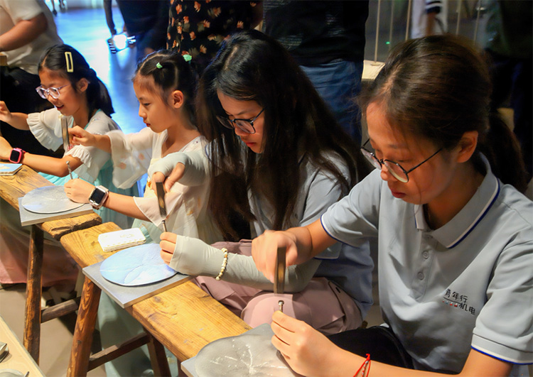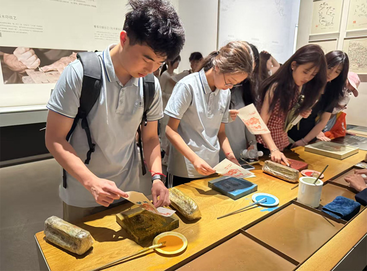 在沉浸式的實踐環節中,隊員們不僅駐足觀賞,更全身心投入到館內豐富多彩的互動體驗項目中。在專門的傳承體驗中心,面對古老的技藝,青年學子們展現出強烈的求知欲和動手熱情。他們親手嘗試了墨香四溢的木板拓印、線條靈動的剪紙、針腳細密的刺繡等傳統工藝。在非遺傳承人耐心細致的指導下,雖然初學者的指尖略顯笨拙,動作尚不嫻熟,但那份全神貫注、屏息凝氣的認真神態,卻讓他們得以穿越時光的隔閡,更真切地觸摸到古老技藝背后所蘊含的嚴謹工序與精益求精的匠心精神。每一次下刀、每一針穿梭,都是對傳統文化的一次深刻體悟。