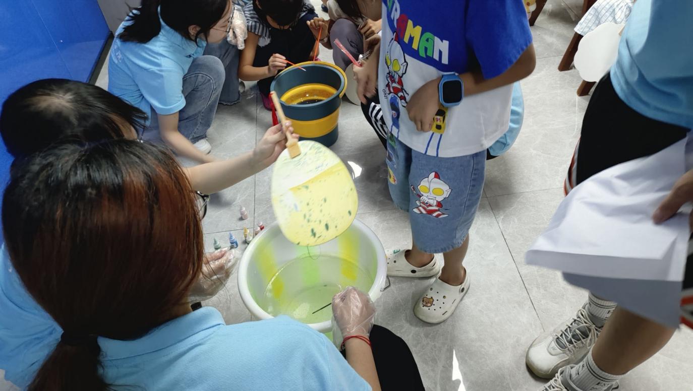 活動伊始,服務(wù)隊宣講組成員程美琳同學(xué)以“漆染歲月非遺魂”為主題展開講堂。她們結(jié)合史料與實物展示,向孩子們介紹漆扇的歷史脈絡(luò)——從2000多年前楚國的禮儀工具,到18至19世紀風(fēng)靡西方的外銷珍品,生動講述了漆扇在不同時代的文化意義。講解中,隊員們重點演示了“飄漆”這一核心技藝:利用天然大漆不溶于水的特性,以點、甩、彈、劃等手法在水面繪制圖案,再將宣紙扇面輕覆其上,使紋樣自然轉(zhuǎn)印。