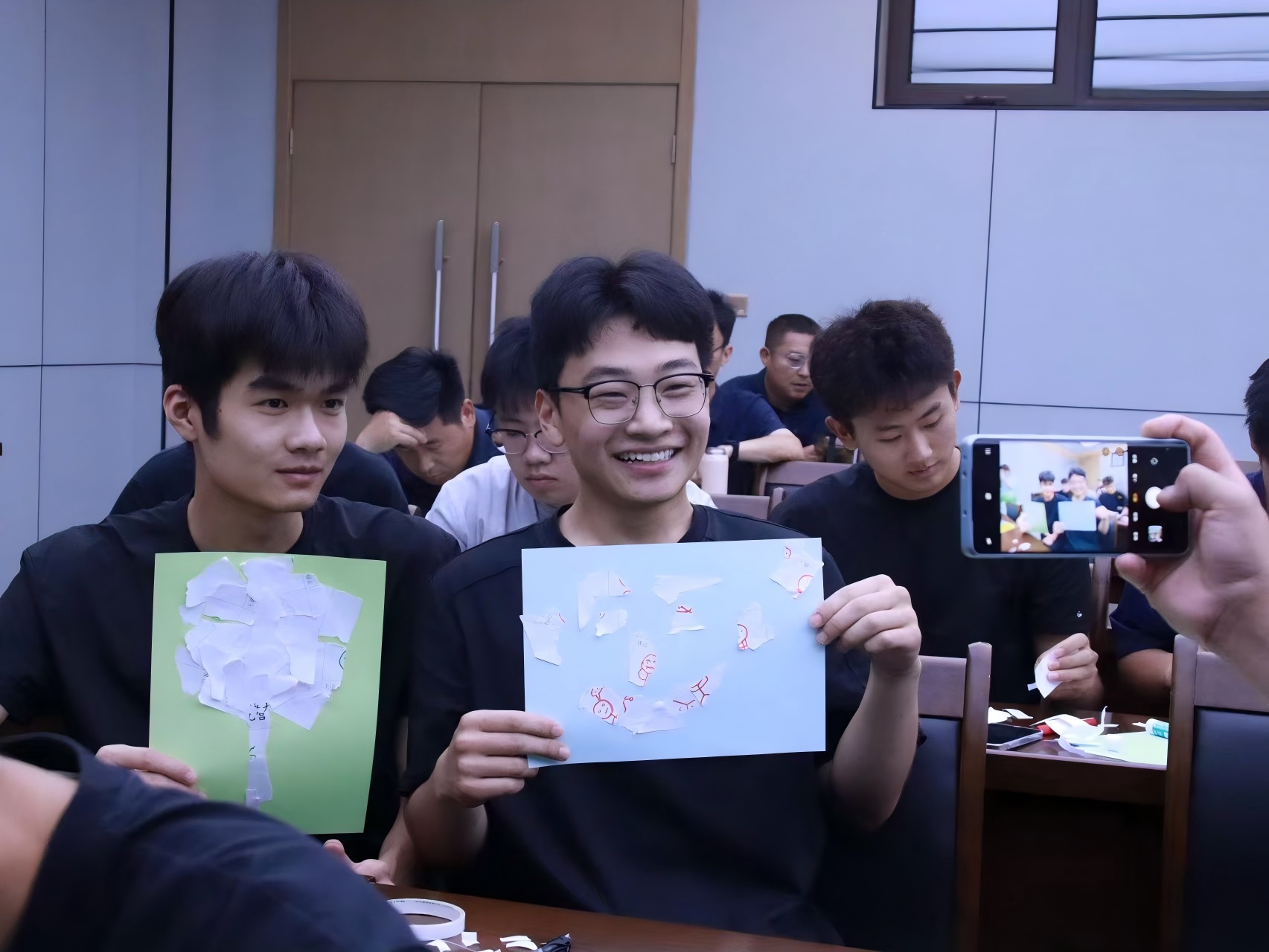 “情緒九宮格”環節,助教們用色彩涂鴉表達心情,親身體驗將抽象情緒可視化的過程,為引導兒童表達感受積累經驗;“解壓拼貼畫”中,大家通過撕紙釋放壓力、拼貼重組圖案,在實踐中理解情緒宣泄與轉化的原理。