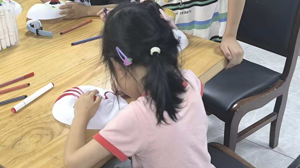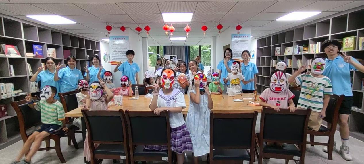 傍晚,“成果展覽暨結營儀式”如期舉行。社區展示區里,孩子們的臉譜、漆扇作品掛滿墻面,各色人物形象栩栩如生,訴說著幾日來的收獲。志愿者播放了活動集錦視頻,從課業輔導時的專注,到手工制作時的投入,每一幀都充滿溫情。