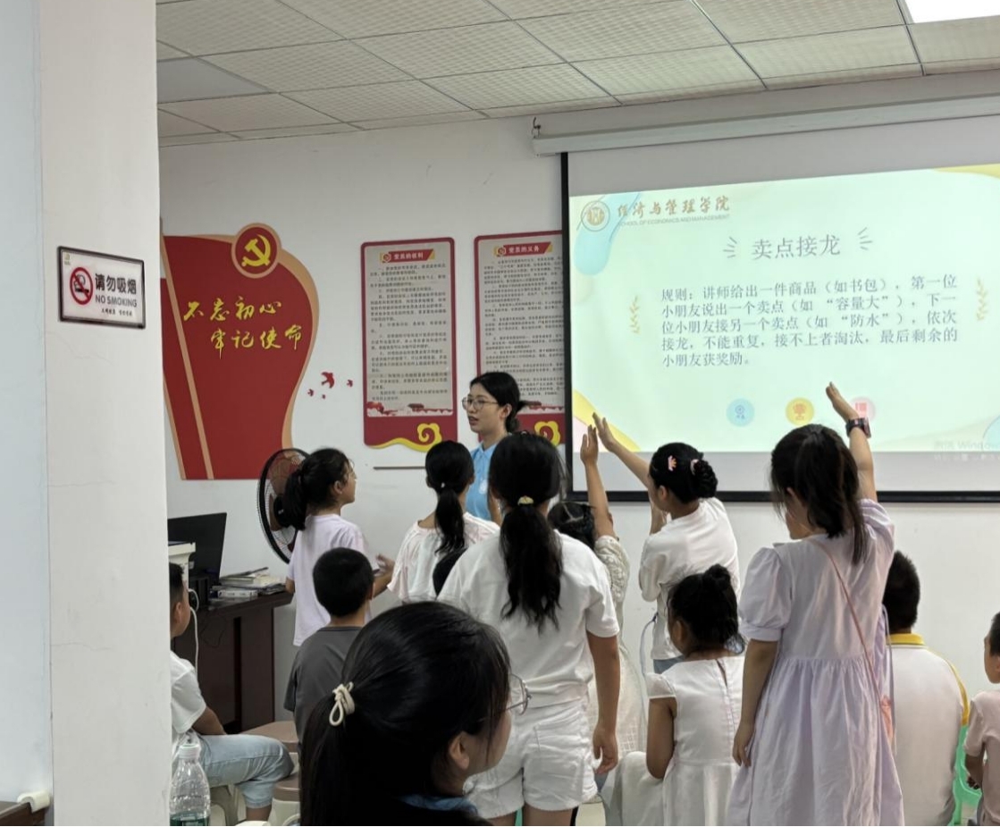 志愿者們隨后又帶領小朋友們體驗了“賣點接龍”“非遺技藝體驗—漆扇”“你來比劃我來猜”“擊鼓傳花”四個精彩小游戲,小朋友們積極參與了各項游戲,在激烈的比拼和設計靈感的噴發下,部分獲得大家認可的小朋友也獲得了他們喜歡的小禮品。通過這四個游戲,小朋友們不僅體驗到了傳統藝術之美,還鞏固了當天學習的銷售知識,進一步深化了他們對經濟的認識和理解。經濟與管理學院院也將繼續學習和貫徹黨的二十大精神,讓新時代的后備軍更加的強大!