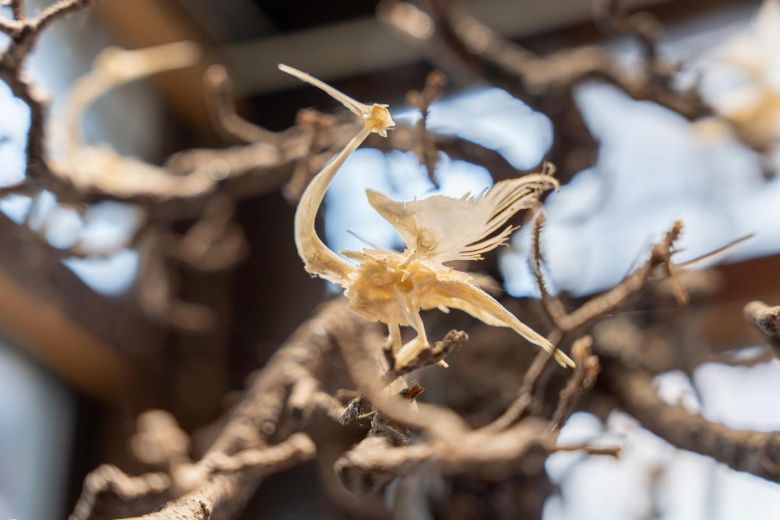 在探訪古城文化的過程中,小分隊遇見象山魚骨造型藝術代表性傳承人裘亞素并與其展開深度訪談。據裘亞素介紹,魚骨畫源自漁民將廢棄魚骨轉化為祈福裝飾的傳統,2021年入選寧波市級非遺名錄。其制作需精選鯔魚、鱸魚等本地魚種的脊椎骨,經蒸煮脫脂、自然晾曬后,通過拼接定型形成花鳥、山水等意象。