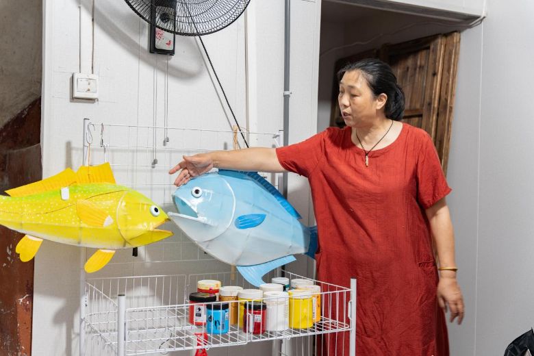 在游覽的過程中,團隊注意到一家掛滿魚燈的店鋪中坐著一位阿姨,她身前的桌上放著魚燈的半成品。經詢問得知這位阿姨是魚燈制作技藝傳承人,于是實踐團隊與魚燈傳承人展開訪談。據傳承人介紹,石浦魚燈可分為“動態魚燈”與“靜態魚燈”兩大類:動態魚燈下有棍子,常用于大型魚燈舞活動,其需通過竹篾定型、棉布裱糊、LED燈帶嵌入等工序,實現“游動發光”效果,側重實用性;靜態魚燈則側重裝飾性與環保理念。