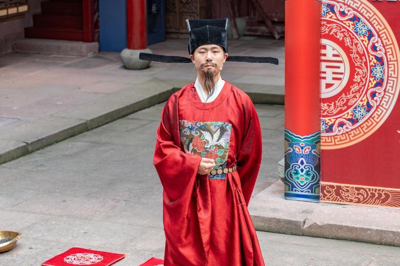 在關帝廟民俗展廳,團隊觀看了古城特色戲劇——“公雞成親”,該戲劇向游客介紹了象山漁文化的婚嫁習俗。觀看后團隊在展廳內重點對“公雞成親”習俗進行考察。據記載,該習俗起源于明清時期東南沿海漁民“嫁雞隨雞”的婚約信仰——當新郎因出海無法歸期,便由小姑懷抱紅布系頸的公雞代行拜堂禮,寓意“宗族延續不可斷”。
