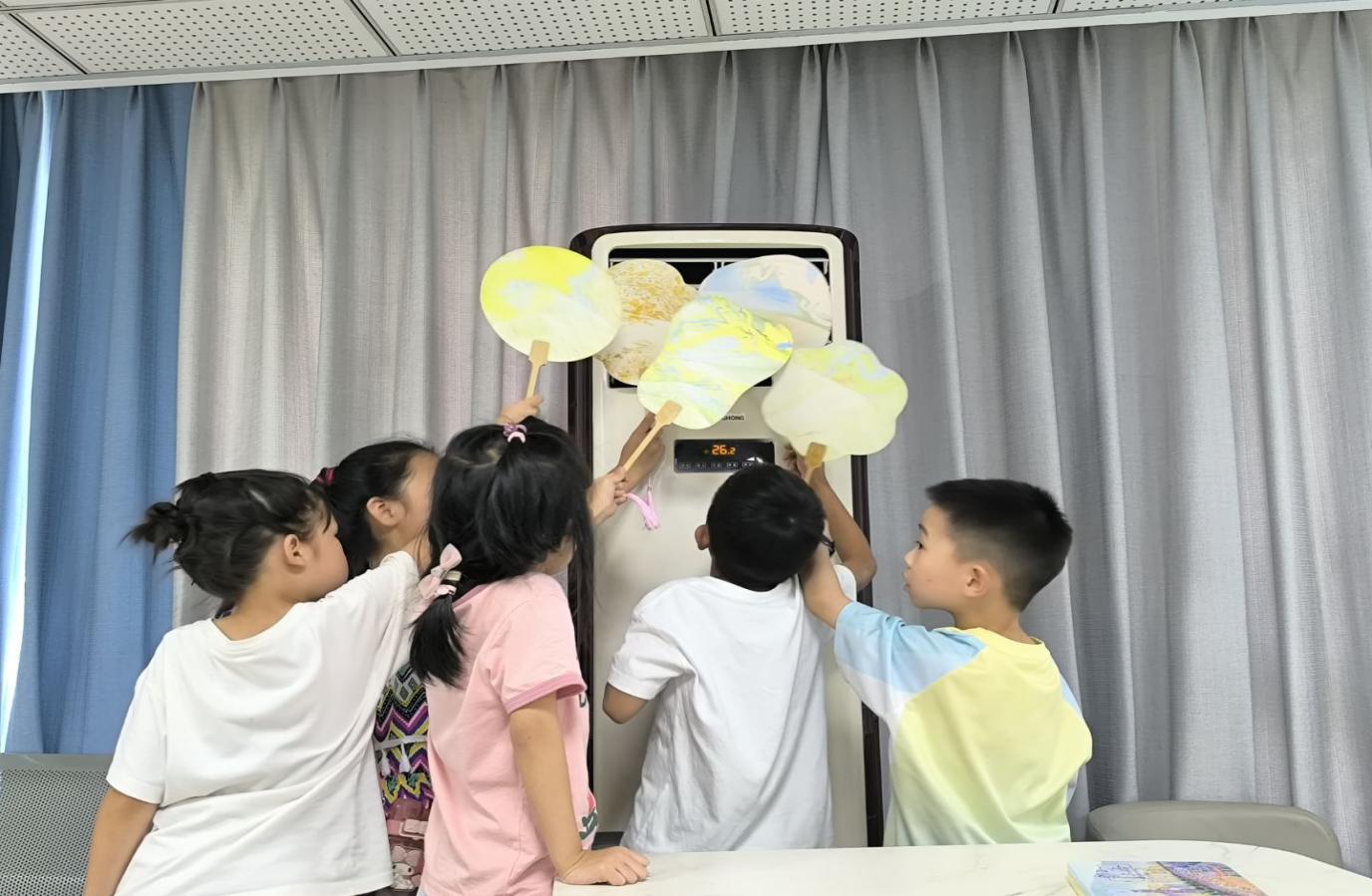 7月8日,志愿者們為孩子們講解漆扇的文化淵源。漆扇作為傳統工藝制品,承載著千年美學,從古代文人雅士的 “掌中風雅”,到如今的文化傳承載體,每一道漆藝工序都蘊含匠心。志愿者們提前備好素扇、顏料等材料。孩子們圍坐桌前,眼中滿是好奇與期待。“先選喜歡的漆色,像點染花瓣,要順著扇面紋理慢慢鋪……” 志愿者手持示范扇,細致講解漆藝基礎技法。制作過程中,孩子們按照秩序排隊選取自己喜歡的顏色,在志愿者的幫助下小心翼翼的給漆扇上色,眼神里充滿了對自己作品的期待。