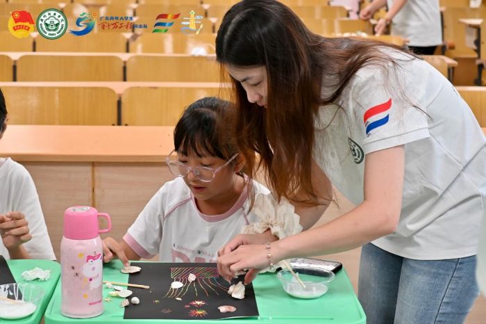 7 月 10 日,南澳縣后宅鎮(zhèn)中心小學(xué)五年級的教室里,廣州新華學(xué)院 “藝路向汕” 三下鄉(xiāng)實踐隊的隊員們正積極準備著貝殼裝飾畫的材料。這場以貝殼裝飾畫為主題的美育課,充滿著濃濃的海島文化,借助南澳島豐富的貝殼資源,讓孩子們在親近自然的過程中學(xué)習(xí)審美與創(chuàng)作。