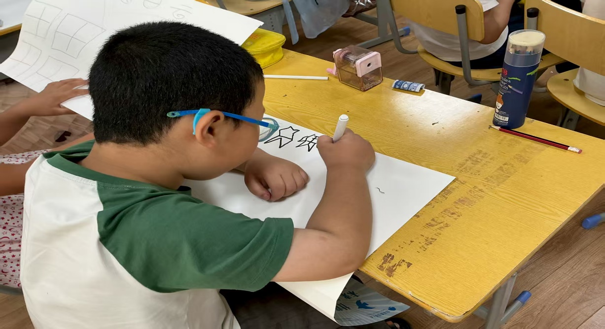 午后陽光透過窗欞,溫柔地灑在課桌上的甲骨文練習冊上。志愿者驚喜地發現,孩子們竟能熟練運用甲骨文進行創作,這讓 “國學小課堂” 有了意外之喜。三位志愿者迅速變身 “甲骨文研究員”,在教室里來回穿梭,幫孩子們找字體、解答孩子們的疑問,教他們用古老文字繪出滿滿的童趣。一筆一劃間,仿佛有殷商的風穿過千年時光,輕輕落在孩子們的畫紙上,也讓文化傳承有了最生動的注腳 —— 它不是枯燥的說教,而是一場你問我答、共同探索的奇妙旅程,教室里的歡笑聲,成了傳統文化最美的回聲。