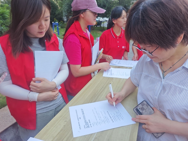 圖為巢湖學院"獻血賦能·健康調研”宣傳團成員在北大街社區發放調查問卷。 曾悅 供圖