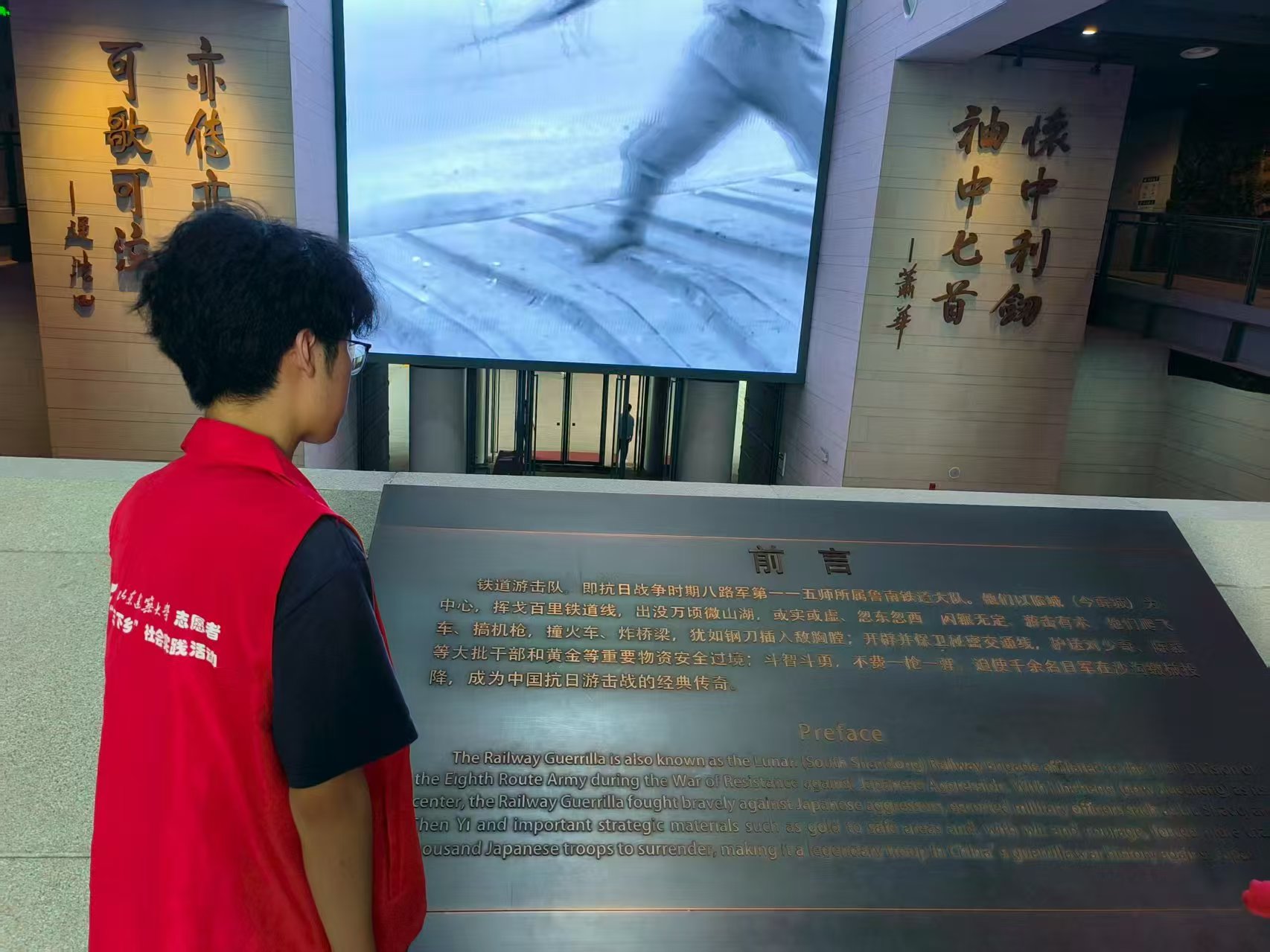 在鐵道游擊隊紀念館,隊員們通過參觀紀念館藏品、聆聽英雄事跡,深入了解鐵道游擊隊在抗日戰(zhàn)爭時期的英勇歷程,感受赤誠報國、不屈不撓、機智果敢的精神內(nèi)涵。看著紀念館展廳中的一幅幅珍貴圖片、一件件實物展品,聽著講解員的講解,隊員們仿佛體驗到了游擊隊員們爬火車、炸橋梁的英勇戰(zhàn)斗場景,深刻體會到了革命先輩為民族解放事業(yè)作出的犧牲與貢獻。