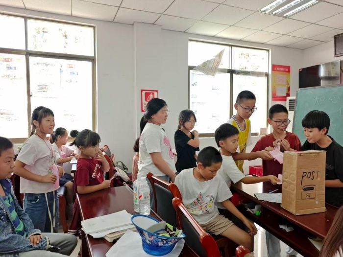 在“我的祖國我奉獻”活動中,《每一個你》的歌聲里,實踐團成員分享中國志愿者的故事,孩子們聽得專注,隨后伏案寫下心中對“奉獻”的理解,又手繪祝福卡片,把純粹的善意悄悄傳遞給中國志愿者。“薪火傳九州,同拼中國夢”環節孩子們積極參與,課堂氛圍持續活躍。省份接龍時,孩子們爭相搶答,用童趣的聯想記住一個個地名。鋪開中國地圖拼圖,大家圍攏協作,小心比對每一塊拼圖的位置,當完整的版圖在眼前展開,稚嫩的驚嘆聲里滿是對祖國疆域的好奇與熱愛。同時,“知心姐姐的魔法信箱”靜靜立在角落,悄悄收納著孩子們的小煩惱,又遞出帶著暖意的回信。