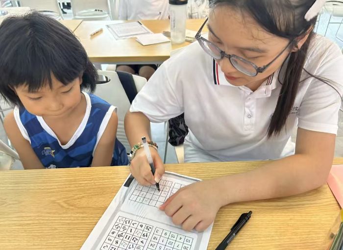 圖為實(shí)踐團(tuán)成員制作舒爾特方格間 楊揚(yáng)攝