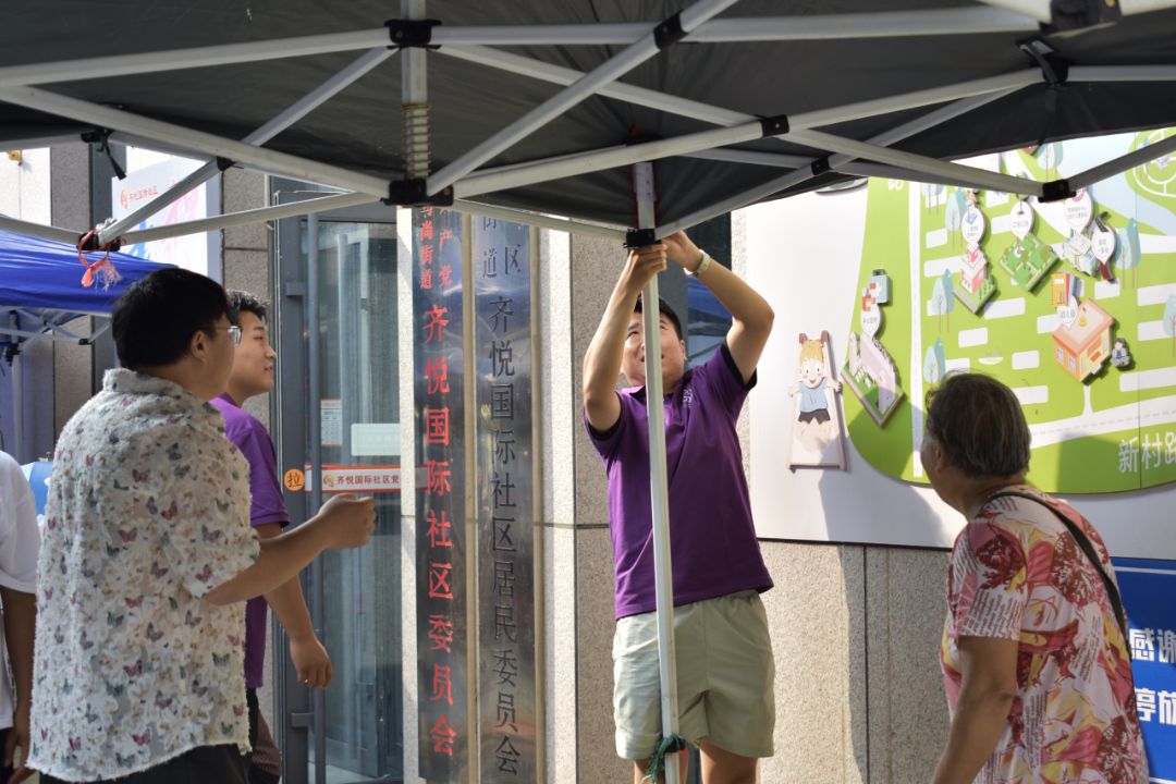 實踐團成員抵達“黃河大集”現場,與社區工作人員對接當日任務。為確保集市在開市前完成各項準備工作,成員們迅速分工,按照預設方案投入布置工作。