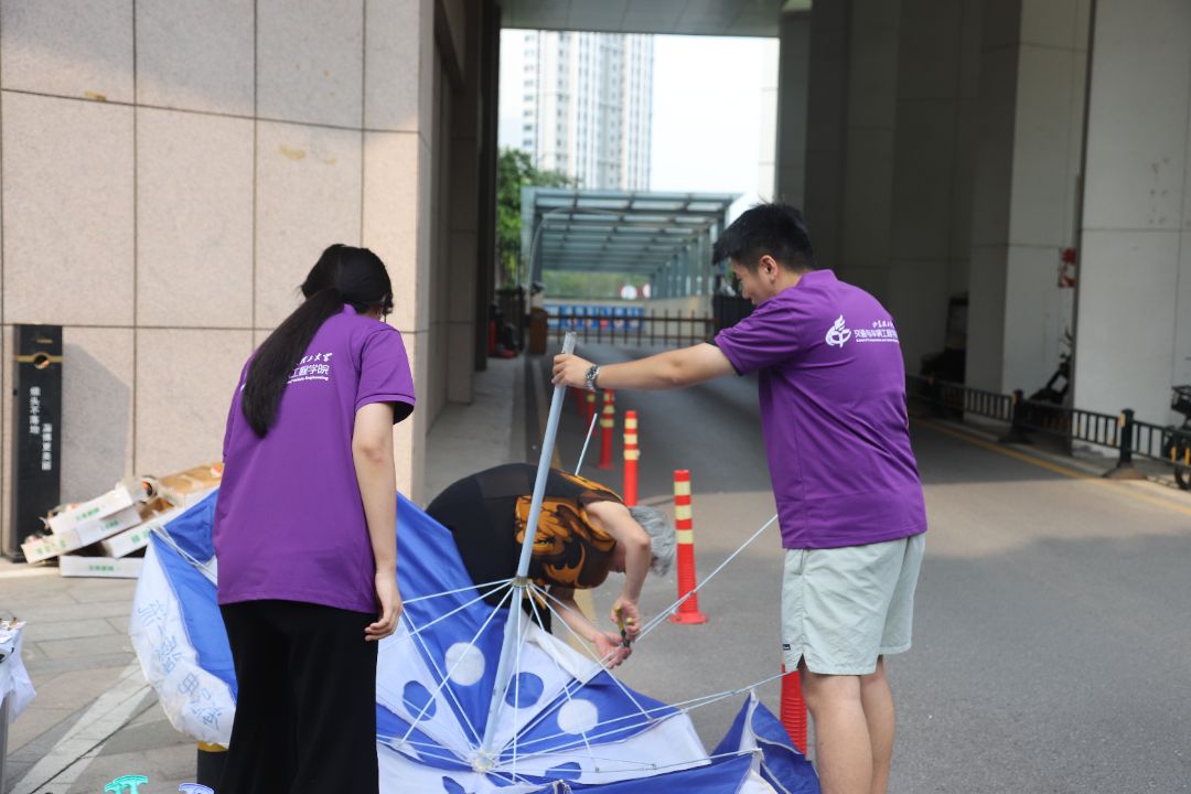 實(shí)踐團(tuán)成員抵達(dá)“黃河大集”現(xiàn)場,與社區(qū)工作人員對(duì)接當(dāng)日任務(wù)。為確保集市在開市前完成各項(xiàng)準(zhǔn)備工作,成員們迅速分工,按照預(yù)設(shè)方案投入布置工作。