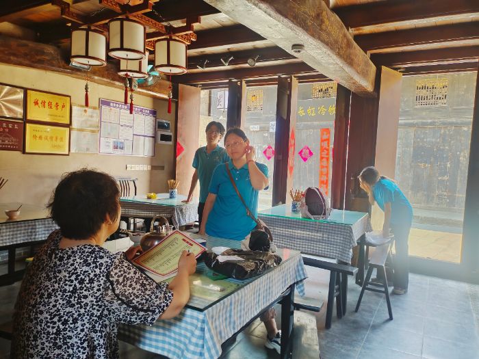 實踐隊走進了擁有著百年歷史的長盛祥農家樂,其講述了湖北的木作營造技術與明代康茂財后代康永盛第三次新建鳳凰街的歷史功績。