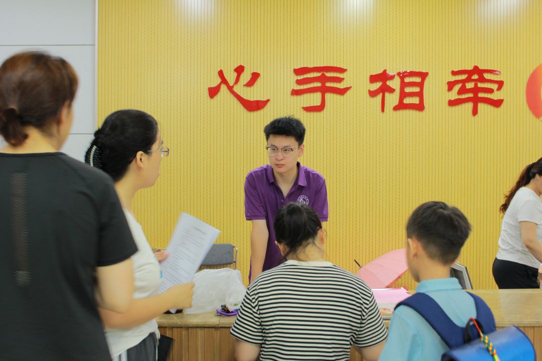 成員們來到社區(qū)后,已經(jīng)有不少想要了解“齊小團(tuán)”暑期課堂的家長(zhǎng)在服務(wù)中心等待,進(jìn)行“齊小團(tuán)”第二期的報(bào)名工作。此時(shí)社區(qū)工作人員也已忙得不可開交。工作人員們看到實(shí)踐團(tuán)成員們的到來,首先對(duì)大家進(jìn)行了鼓勵(lì),然后根據(jù)現(xiàn)場(chǎng)情況給成員們安排了工作——幫助指導(dǎo)“齊小團(tuán)”暑期課堂學(xué)生家長(zhǎng)填寫報(bào)名表。成員們根據(jù)任務(wù)流程,將工作分為接待、填寫、電腦錄入等環(huán)節(jié),成員們各司其職,保證井然有序的同時(shí)更好地完成工作,做到高效率、人滿意。