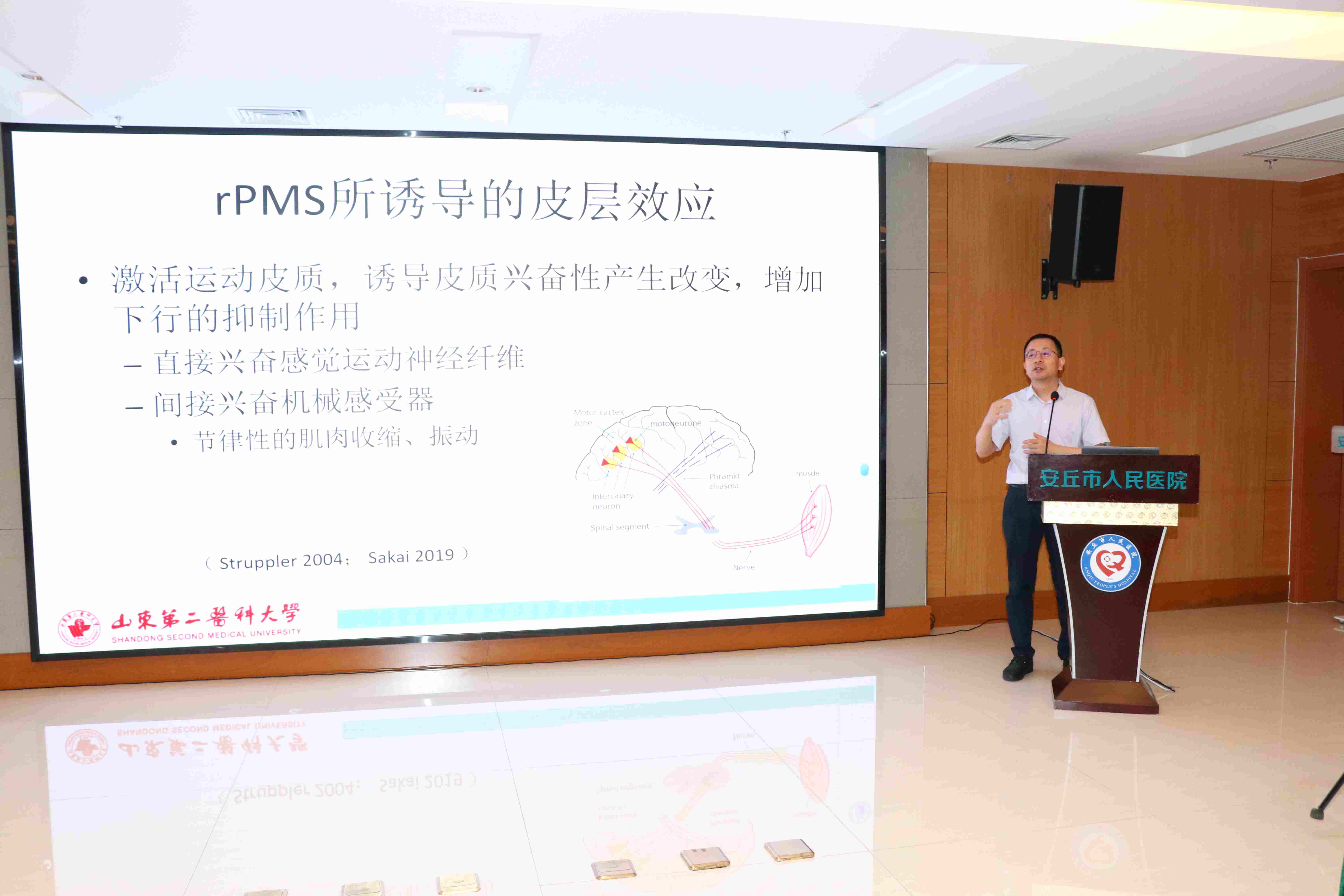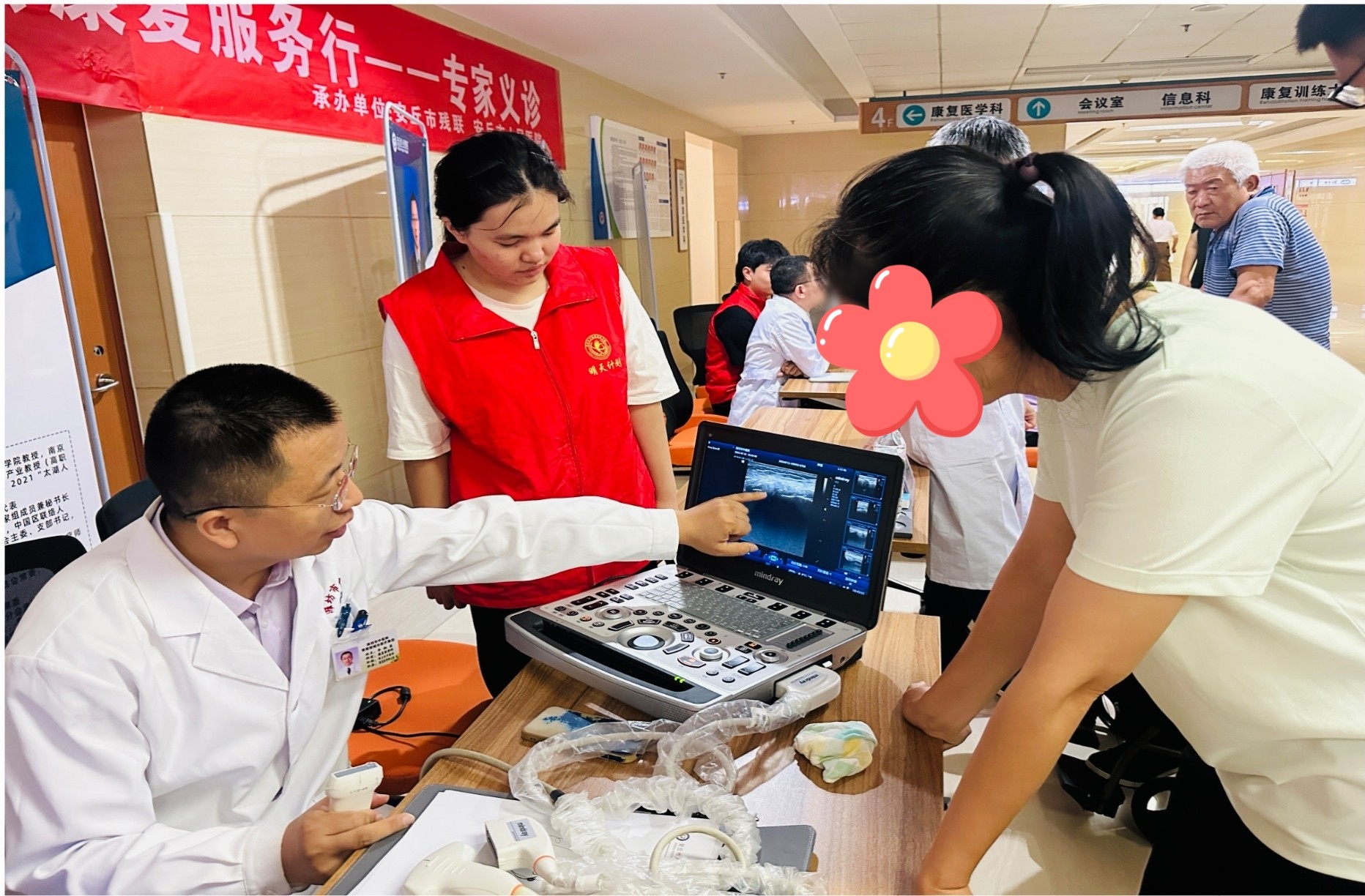 在安丘市人民醫院,雙方首先進行了座談交流,圍繞康復醫學學科建設、人才培養、科研合作和技術提升等展開深入探討,為院校協同發展,共同推進區域康復醫療服務能力注入新的動能。隨后,實踐團隊在康復大廳外為附近居民和住院患者提供義診與康復咨詢服務。參加義診咨詢的有暑假歸來有肌骨問題的大學生,長期加班導致腰痛的年輕人,多發性骨折術后、肩袖損傷、脊髓損傷及腦卒中等的中老年人,義診專家用專業的理論知識和豐富的診療經驗,通過細致的問診、檢查和康復評定,結合超聲等技術進行精準診斷,制定針對性的康復治療計劃,指導患者康復訓練技巧及注意事項,并進行居家和病房內康復指導,與當地醫務人員就咨詢者的功能和康復情況進行溝通與交流,進一步提升基層醫療水平。義診結束后,中國康復醫學會物理治療專業委員會副主任委員劉浩教授做了題為《基于神經調控的rPMS技術改善肌痙攣》的專題講座,結合個人研究講述了rPMS技術的生理效應、作用機制及治療肌痙攣的臨床應用進展,為當地醫護人員帶來前沿康復知識和先進理念,促進臨床能力的提升。