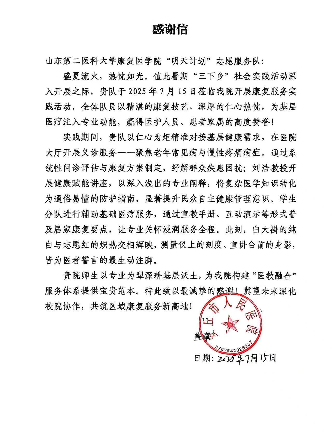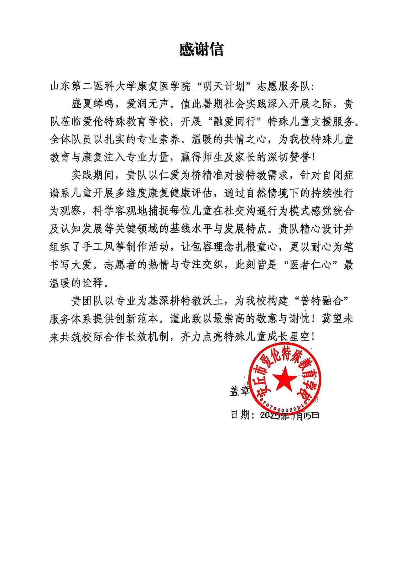 活動結束后,安丘市人民醫院與愛倫特殊教育學校相繼呈遞感謝信函,以最質樸的方式詮釋著最深厚的情誼。字里行間,既有對專家團隊精湛醫術的由衷贊嘆,亦飽含對學生志愿者無私奉獻的深切感動。一紙素箋,勝過千言萬語的褒獎,這份認可,承載著基層群眾最真摯的心聲。這份無言的感動,必將化作學院繼續前行的力量,在健康中國的征程上書寫更多溫暖篇章。