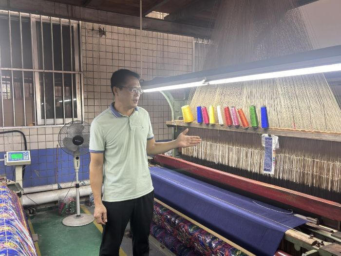 圖為周廠長介紹壯錦的原材料來源。韋可明攝