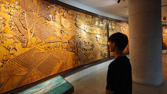 市井繁華:感受紅色沃土上的煙火人間 博物館中最具互動感和視覺沖擊力的展廳之一,是依據《清明上河圖》再現的“市井繁榮圖”。雕塑與繪畫相結合、二維與三維藝術融合,復原了大運河淮北段的繁華景象。街市、碼頭、商販、驛道……一幅幅生動畫面躍然眼前,仿佛讓人置身隋唐盛世。