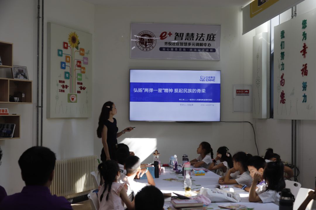 為厚植青少年愛國主義情懷,鼓勵青少年貫徹“熱愛祖國、無私奉獻,自力更生、艱苦奮斗,大力協同、勇于登攀”的“兩彈一星”精神內涵,賡續紅色基因與奮斗血脈,7月28日,山東理工大學“循夢而行”暑期實踐團于齊悅國際社區開展了一場別開生面的“兩彈一星”精神宣講課。實踐團特別邀請了中核集團的資深員工劉勝男擔任宣講人。那段波瀾壯闊的歷史和震撼人心的精神力量被巧妙融入生動的教學環節,使課堂成為與“兩彈一星”精神進行深度對話的舞臺。