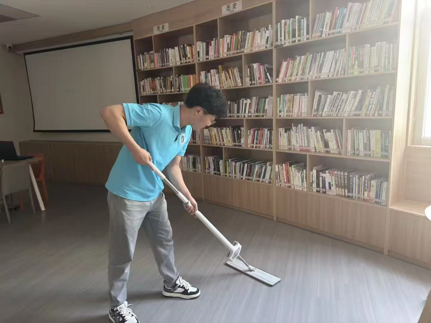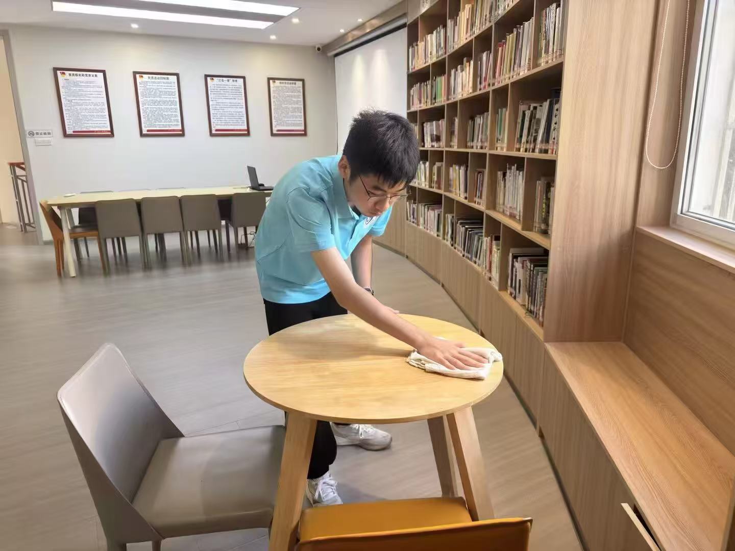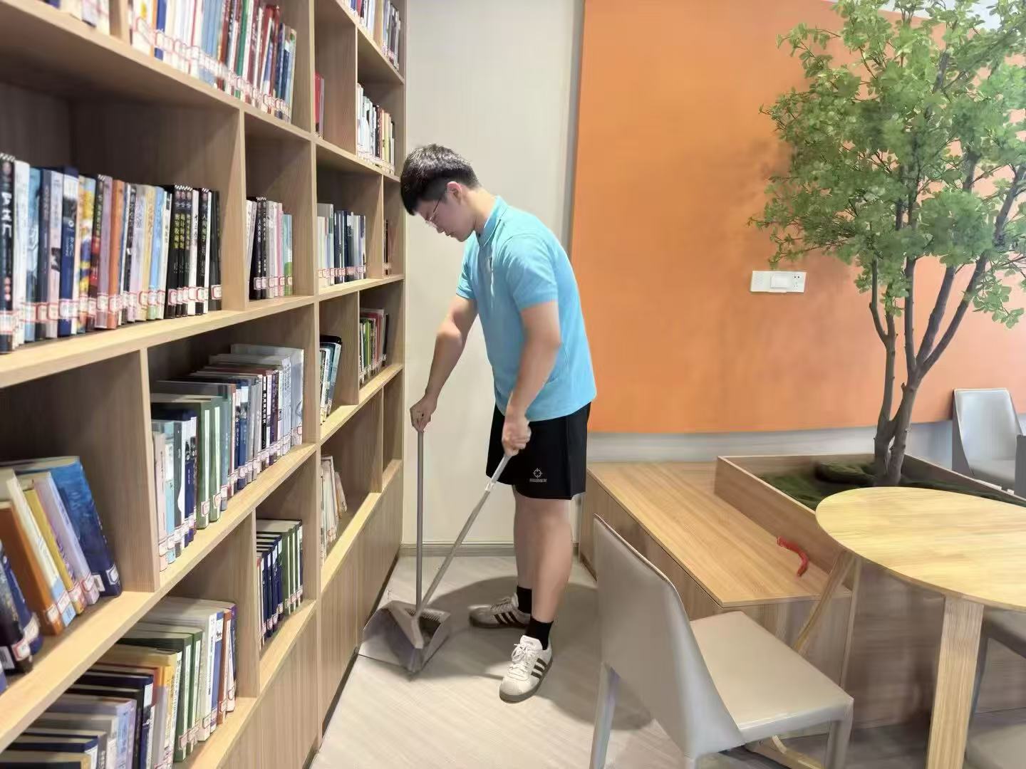 整潔明亮的閱讀空間前,實踐團成員身著隊服整齊列隊。空間內,成員們分工協作,有條不紊地整理書架、清掃角落、擦拭桌椅。閱讀空間外,另一組隊員對周邊無序停放的共享電動車進行規范擺放,恢復社區環境整潔有序。成員們揮汗如雨,用行動美化社區環境,用服務傳遞文明理念。隊服胸前的校徽與他們忙碌的身影相映成趣,彰顯新時代青年服務社會的熱忱。