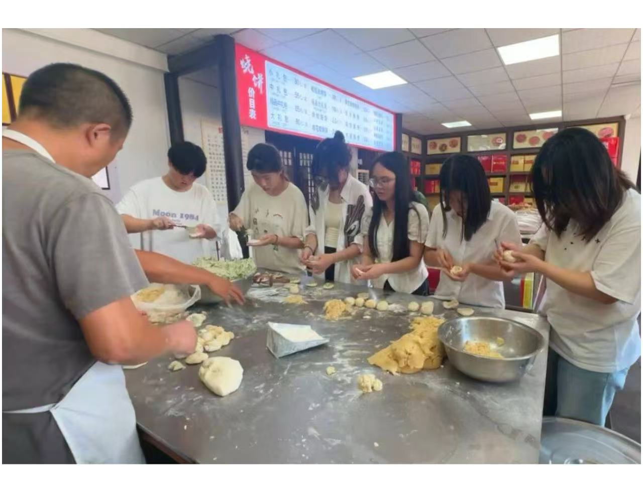 走出黃橋戰役紀念館,那些與黃橋燒餅相關的展品仍在眼前浮現,百姓支援前線的場景仿佛就在昨日。為了更真切地感受那段軍民同心的歲月,團隊成員們來到當地的燒餅工坊,親手體驗黃橋燒餅的制作。在燒餅店內,團隊成員們在張師傅的指導下,和面、制酥、包餡,每個人制作二十個燒餅。揉進面團的不僅是餡料,更是一份沉甸甸的紅色記憶。