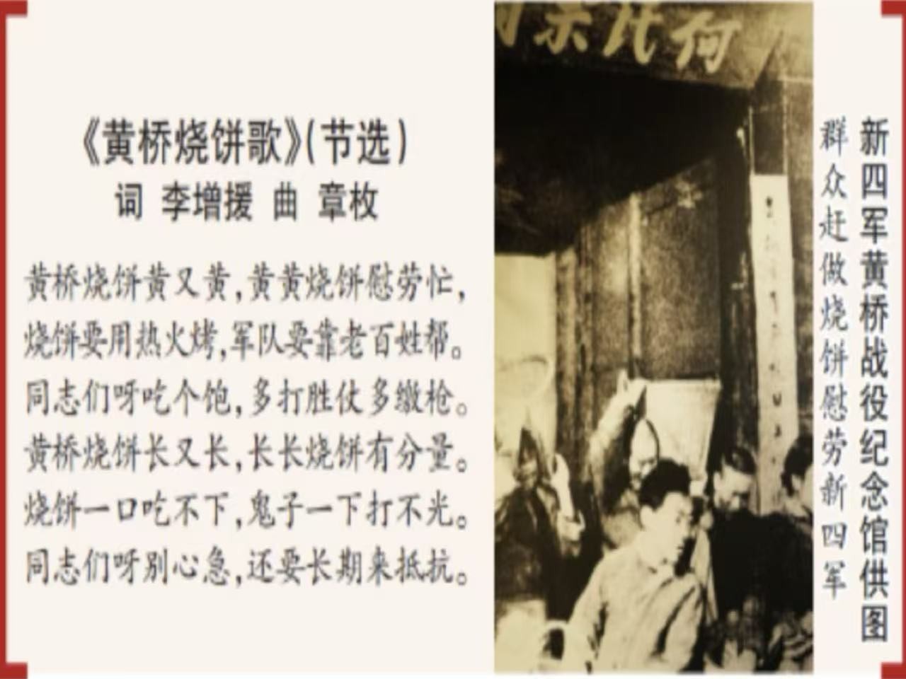 “燒餅傳遞的不僅是食物,更是民心。”團隊成員感慨道。戰役期間,黃橋鎮呈現“家家無閑人,戶戶做燒餅”的壯景:老人揉面、婦女燒水、兒童撿柴,青壯年穿越火線送餅。一首黃橋燒餅歌由此誕生:“黃橋燒餅黃又黃,黃黃的燒餅慰勞忙,燒餅要用熱火烤,軍隊要考老百姓幫。同志們呀吃得飽,多打勝仗多繳槍”,歌詞道出了軍民魚水情的真諦。新四軍戰士捧著百姓手制的燒餅,士氣大振,最終以少勝多,奠定了蘇北抗日根據地的基礎。