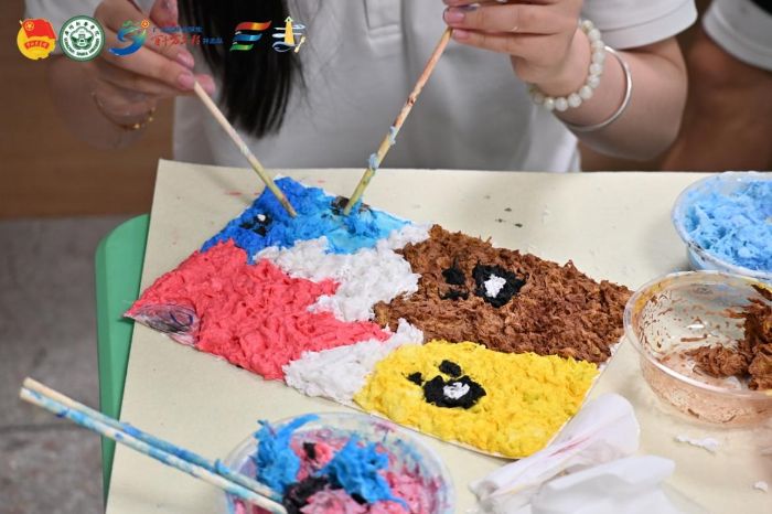 制作紙漿時,突擊隊隊員戴小雨跟同學們講解,“不同顏色的紙漿要分開存放,尤其是深色和淺色,否則容易串色,影響圖案的清晰度。” 她還示范了膠水的添加比例,當膠水與紙漿的比例大概在 1:5時,既能保證粘性,又不會讓作品干后起皺。” 孩子們聽得專注,時不時點頭回應,手上的動作也更加謹慎。